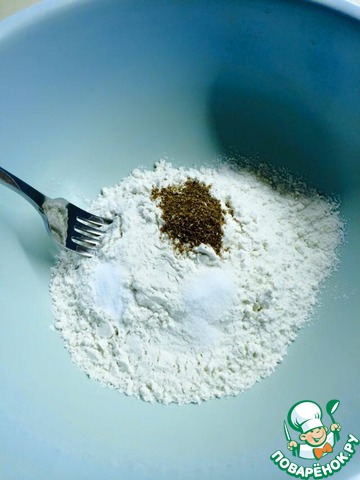Смешиваем сухие ингредиенты: мука, соль, сода, кориандр в течение 1 мин! Я делаю это вилкой (смесь получается однородной и рыхлой).