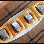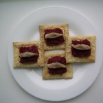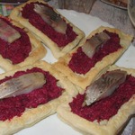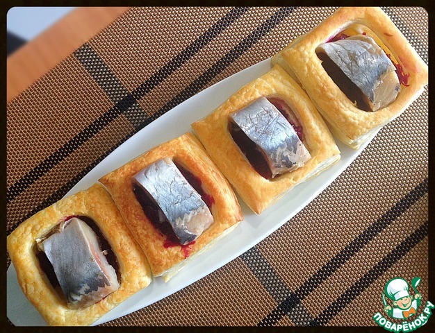 Слоеное тесто слегка разморозить, тонко раскатать и вырезать прямоугольники произвольного размера, примеряя их под размер ломтиков сельди. Из половины прямоугольников вырезать окошки, края нижнего прямоугольника смочить водой и положить сверху получившиеся бортики. Запекать при 200 С до зарумянивания.