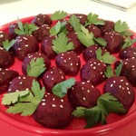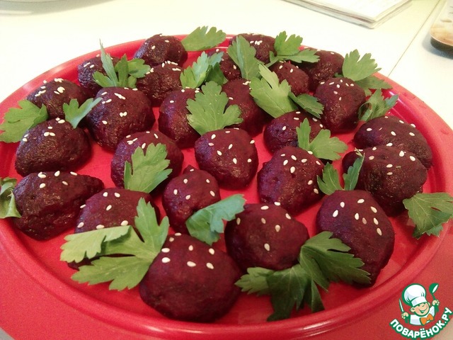 Из свекольно-картофельного пюре сформировать лепешку небольшого размера, положить немного селедочной начинки, соединить края и придать форму клубники. Смешать оливковое масло и лимонный сок, смазать каждую клубничку, украсить листиком петрушки и посыпать кунжутом.