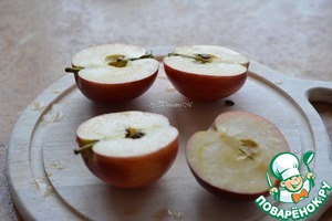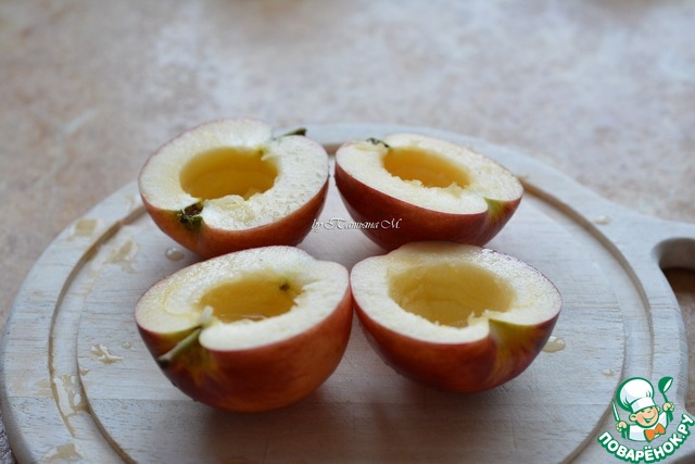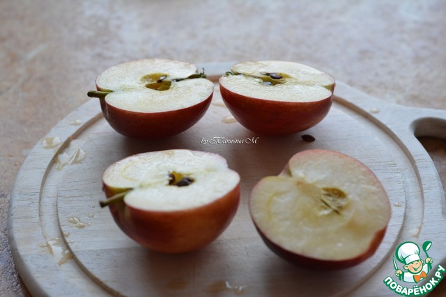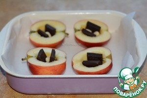 Выложить яблоки в форму на пергамент, в кармашек положить по 2 кусочка шоколада и 2 орешка.