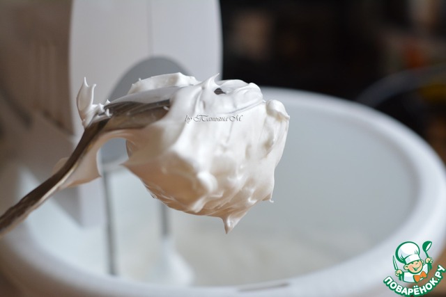 Взбить белки с сахаром до крутых и стойких пик, меренга не должна обваливаться с перевернутой ложки (для кислинки можно добавить щепотку лимонной кислоты).