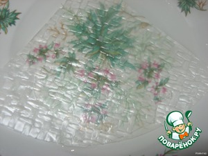 Листы рисовой бумаги замочить в воде на 2 минуты, воду слить.