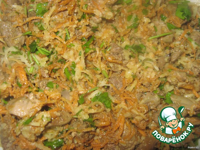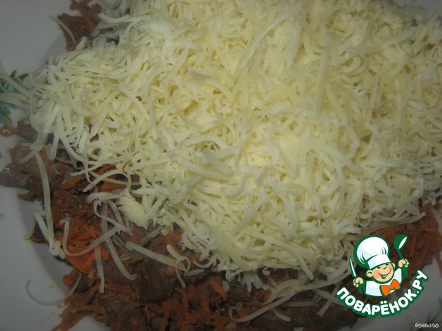Печень с морковью немного охладить, добавить к ним зелень и сыр. Перемешать.