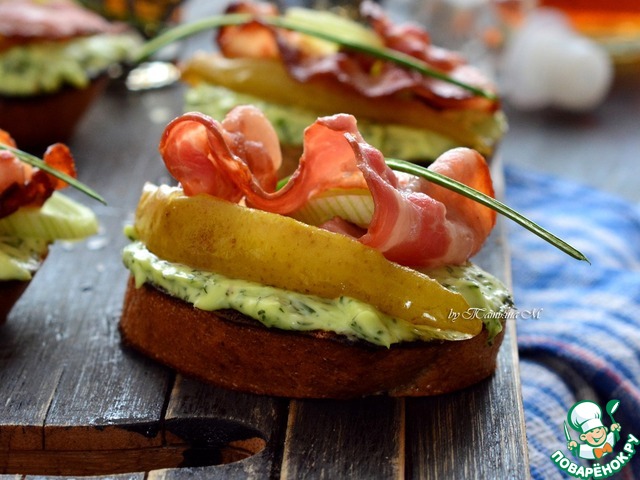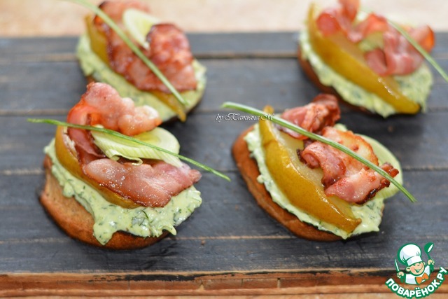 Не знаете, какой закуской угостить мужчину на 23 февраля? Предлагаю вам приготовить для него такие тартины, отлично подходящие под крепкие спиртные напитки! Хрустящий хлебец, чесночно-сливочное масло, прожаренный бекон и карамелизированная груша, которая прекрасно оттеняет своим сладковатым вкусом остальные ингредиенты и смягчает остроту чеснока! Мой муж уже успел оценить и теперь эти бутерброды - одни из любимых на нашем столе!