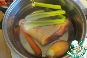 • Для начала сварим бульон. Вместо рульки можно использовать кусок свинины с косточкой. Черешки сельдерея можно заменить куском корня сельдерея или корнем петрушки.