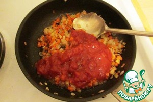 • Добавляем к моркови и луку томатную пасту и жарим около 5 минут.