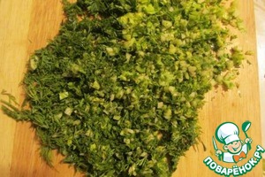 • Зелень укропа и петрушки вместе с чесноком мелко рубим.