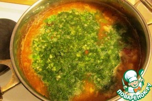 • Приправляем щи солью по вкусу и засыпаем зелень с чесноком.