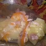 • Снимаем мясо с рульки и мелко его рубим.