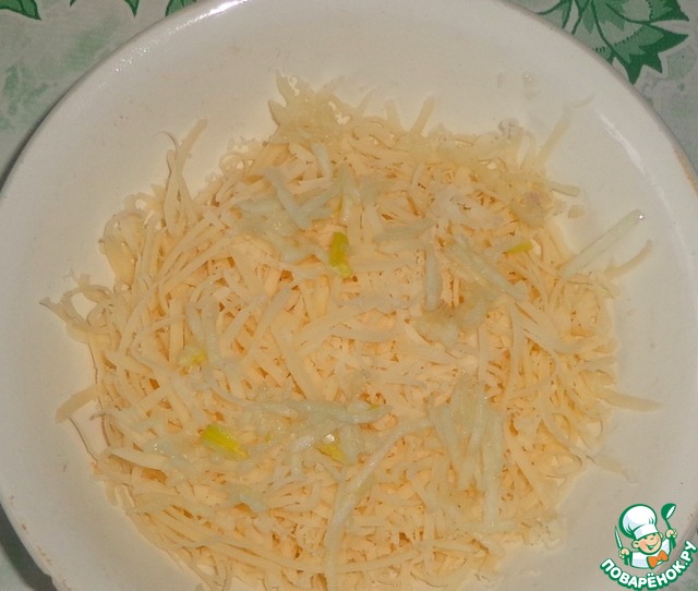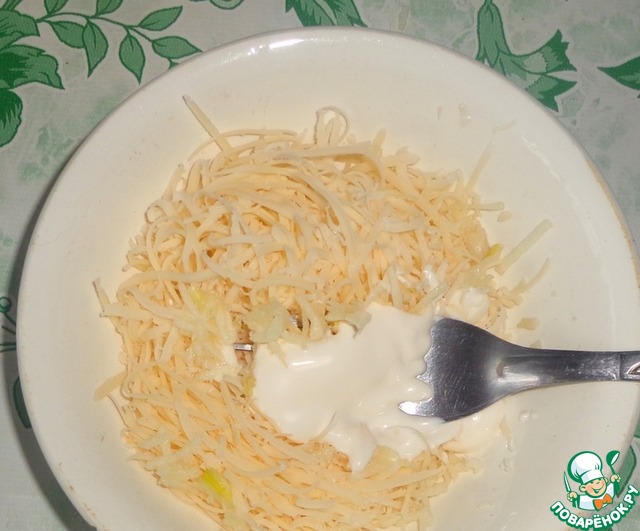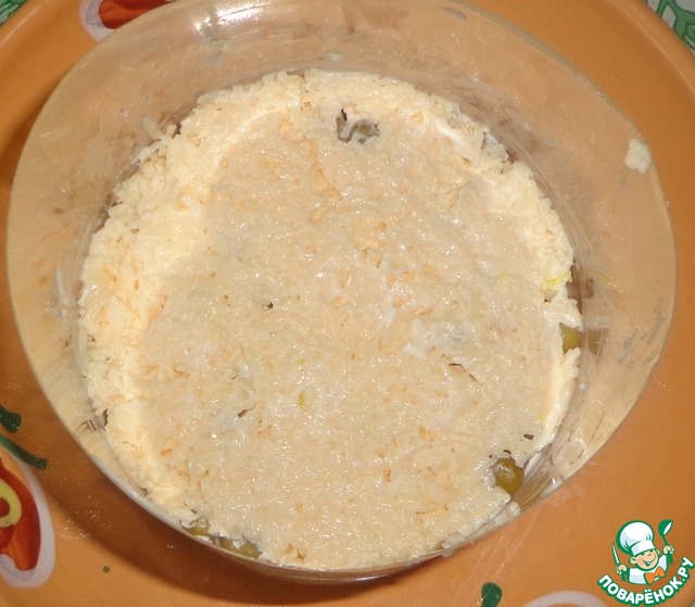 На крупной терке натереть яйцо. Слой из яйца смазать майонезом или сметаной.