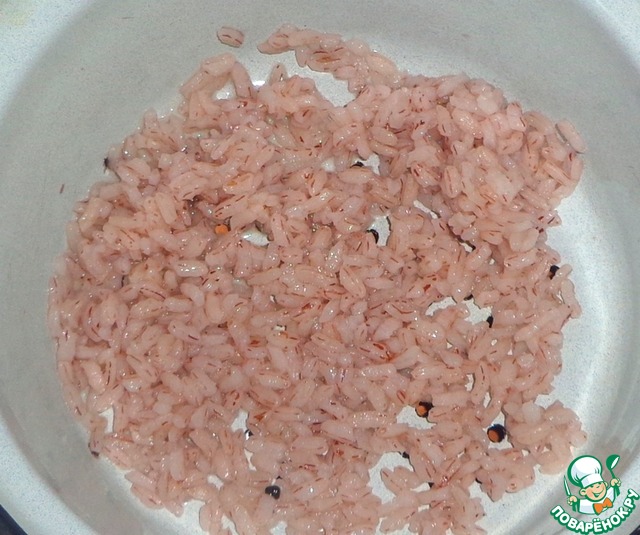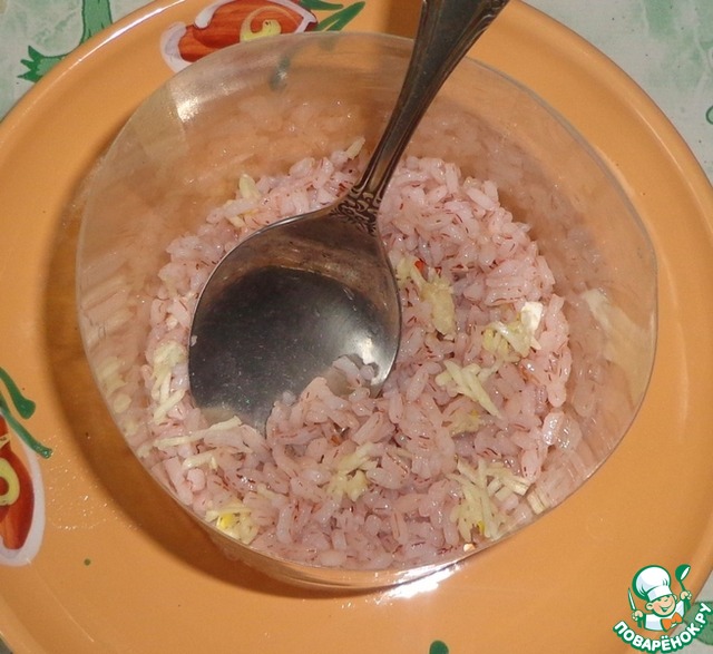 Рис смешать с измельченным зубчиком чеснока. Выложить слой из красного риса.