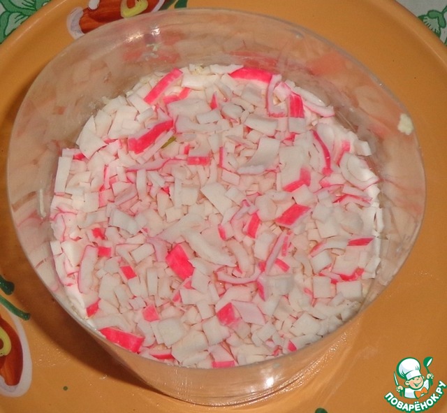 Мелко порезать крабовые палочки, кладем слой из крабовых палочек, это последний слой.
