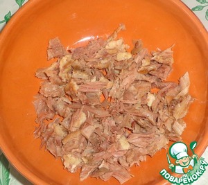 Отварное мясо порезать не мелко. Можно мясо просто разобрать руками на небольшие кусочки. Для салата я взяла отварные гусиные бедра.