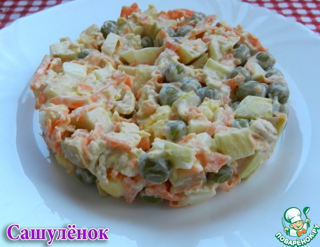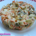 Салат родом из 80-х. Не смотря на свою кажущуюся древность, он до сих пор актуален в нашей семье. Почему-то раньше всегда его готовили на 8 марта. Сейчас праздников в нашей жизни прибавилось, и, мне кажется, он будет неплох к ужину на двоих.