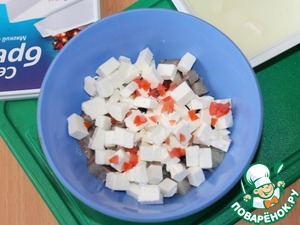 5. Добавить в миску нарезанную небольшими кубиками брынзу,