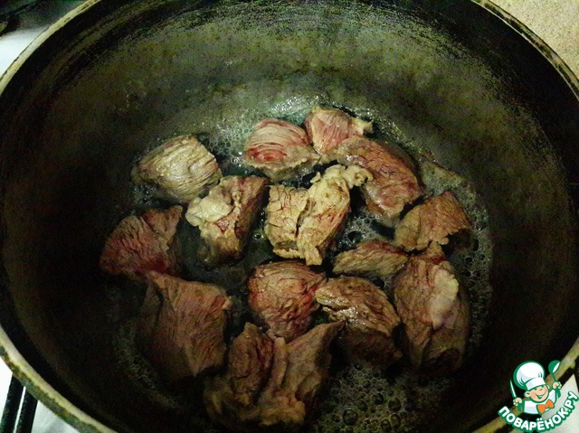 Нарезать мясо крупными кусочкам. В казане разогреть масло и обжарить мясо до исчезновения крови и до появления золотистой корочки