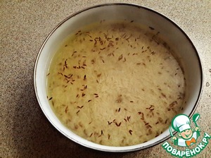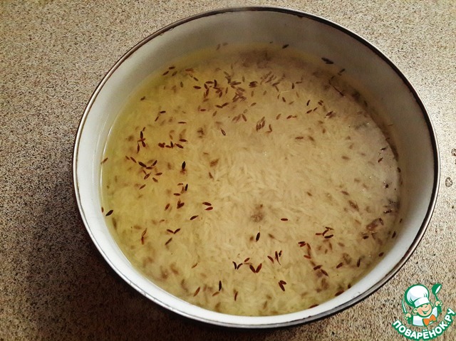 Тем временем промываем рис, заливаем его кипятком, посыпаем зирой и накрываем крышечкой.