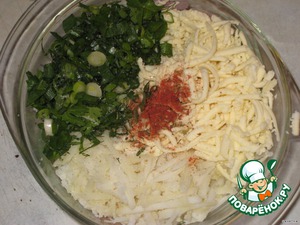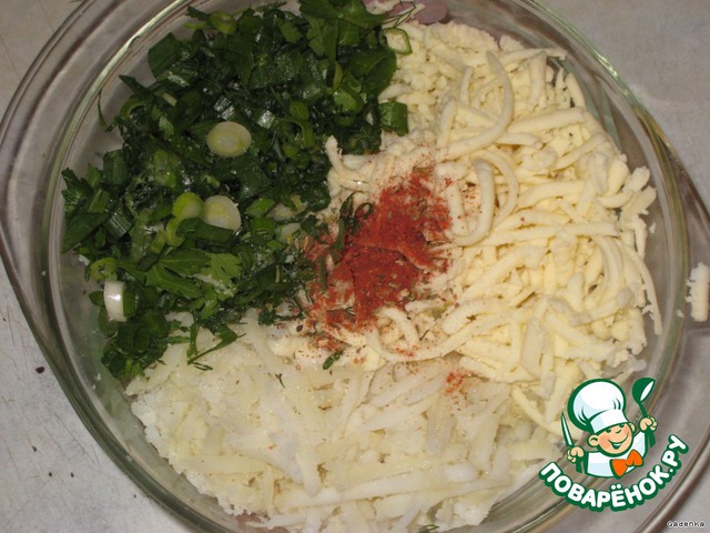 Адыгейский сыр, картофель, зеленый лук, укроп и петрушку, перец, паприку, орегано смешать.