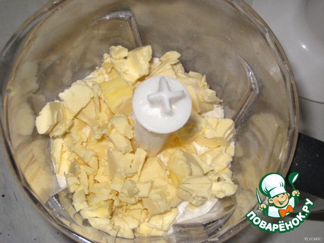Замороженный маргарин порезать на кусочки и добавить в муку с разрыхлителем.