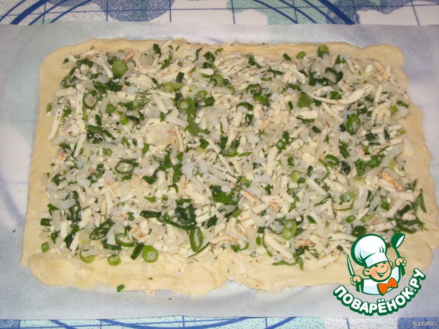 Половину теста раскатать в прямоугольный пласт, толщиной 0,5 см. Раскатывать лучше сразу на бумаге для выпечки, чтобы не добавлять муки.