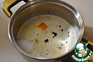 Сливки, сахар, желтки и ваниль кладем в кастрюльку и ставим на огонь, непрерывно помешивая. -