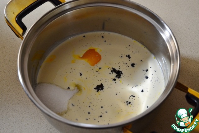 Сливки, сахар, желтки и ваниль кладем в кастрюльку и ставим на огонь, непрерывно помешивая.