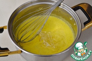 Когда смесь достигнет 82 градусов, т. е. дойдет практически до кипения и крем начнет загустевать, снимаем его с огня и добавляем отжатый желатин. Хорошо перемешиваем.