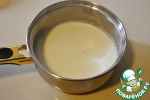 Подогреваем молоко и добавляем отжатый желатин, хорошенько перемешиваем. -