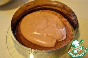 Выкладываем дакуаз в формы (в обе, большую и маленькую). Сверху на него выкладываем немного шоколадного мусса (примерно треть). То же самое проделываем и с маленькой формой.