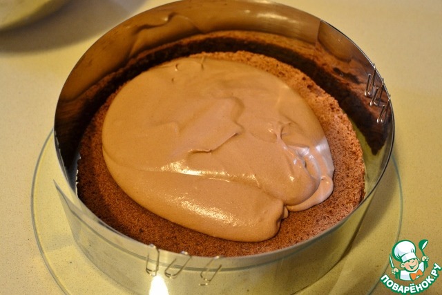 • Выкладываем дакуаз в формы (в обе, большую и маленькую). Сверху на него выкладываем немного шоколадного мусса (примерно треть). То же самое проделываем и с маленькой формой.