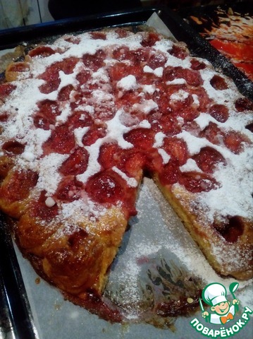 Отступив от края 5 см выстелить по кругу клубнику. У меня очень крупные ягоды (муж удружил!) и мне пришлось из разрезать, лучше выбирать средние ягоды. Смешать немного пудры с крахмалом и посыпать клубнику. -
