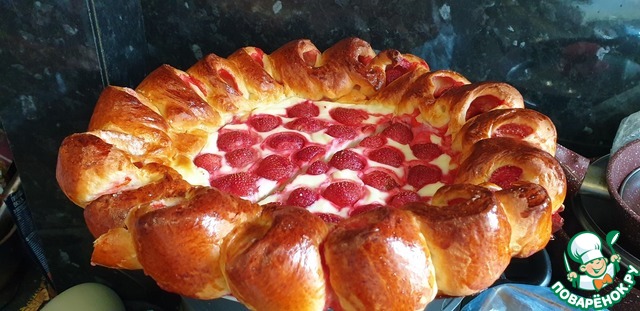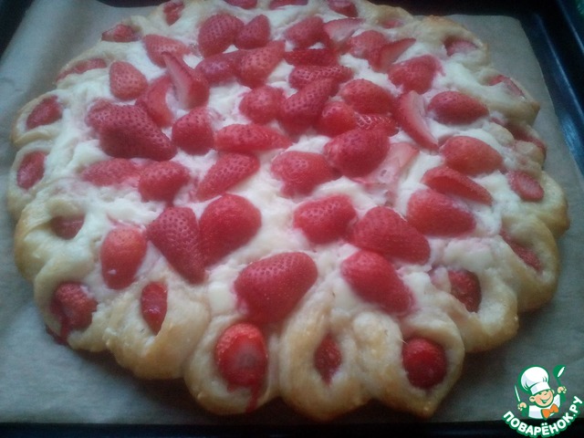 Выстелить ягодами клубники. И поставить на расстойку в теплое место, минут на 20.