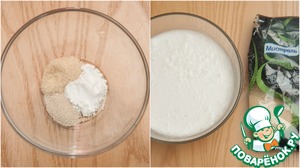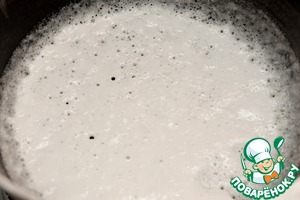 • Дрожжи смешиваем с 1/4 ч. л. муки и сахара, заливаем их 1/4 теплой воды, оставляем на 10 минут. В кокосово-рисовую смесь вливаем подготовленную дрожжевую водичку и кокосовое молоко, добавляем сахар и соль, снова пробиваем блендером и оставляем на 2-3 часа под пленкой для брожения в теплом месте. После 2 часов смесь покроется симпатичными пузырьками. Мне тесто показалось недостаточно сладким и я добавила еще 1.5 ст. л. сахара.