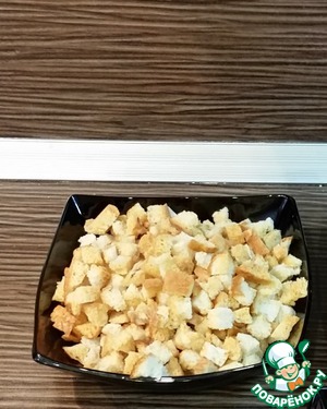 Из чесночной булочки делаем сухарики. Булочку мелко режем, выкладываем на противень, ставим в разогретую духовку и немного поджариваем до золотистого цвета. Затем достаем и хорошенько даем им остудиться.