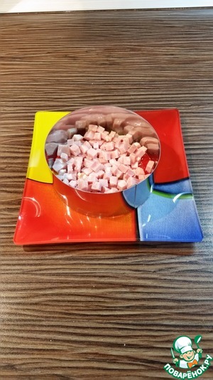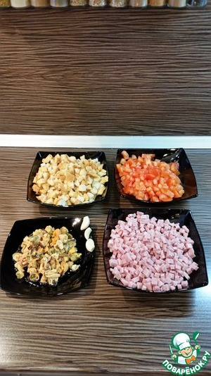 Ветчину, помидоры мелко режем кубиком. Чеснок мелко порубить. Мидии откинуть на дуршлаг и даем маслу стечь, после чего мидии режем пополам.