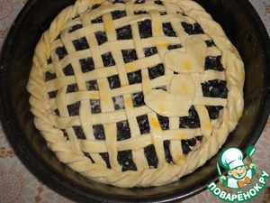 Вторую часть теста раскатать, нарезать на полоски шириной 1 см. Оформить вверх пирога сеточкой из полосок теста, из кусочков теста вырезать сердечки и выложить на пирог. Края пирога фигурно защипнуть.