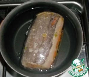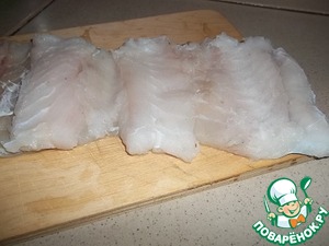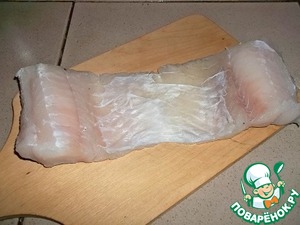 Главное, как я уже сказала, найти подходящий кусок рыбы. У меня была большая рыбина, весом 1,3 кг, типа трески (типа, потому что точного названия рыбы не знаю, очень трудно найти перевод с камерунского жаргона). Отрезала подходящий кусок, надрезала по хребту, удалила кости. Вот такой кусок филе на кожице получился.