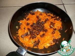 Морковь натереть на терке, лук мелко нарезать, потушить до готовности с 1 ст. л. раст. масла. Можно взять корейскую морковку, вкус рулета будет пикантный. К остывшей моркови добавить мелко нарезанные финики.