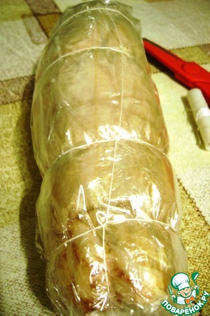 Туго скрутить рулет и обвязать кулинарной нитью. Если кожа как бы тянется от брюшины – растягиваем и скручиваем в натяжку. Плотно заворачиваем в пакет для запекания и сверху еще раз перевязываем, пакуя, как колбасу. Убираем в холодильник на сутки.