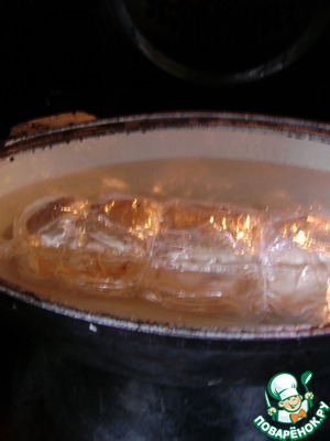 Кладем упаковку рулета в подходящую посуду, в идеале - утятницу. Заливаем холодной водой, чтобы покрыла на пару пальцев, придавливаем тарелкой, чтобы рулет не всплывал, накрываем крышкой и ставим температуру 90 градусов, а время – 2 часа.