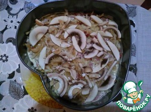 Дальше идет слой яблока которое мы натерли на терке и гриб (сырой) порезанный тонкими полукольцами.