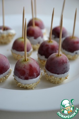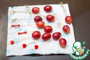Отделяем виноградинки, протираем от налета и обсушиваем салфеткой. Нанизываем на зубочистки или шпажки. Отправляем в морозилку минимум на час, можно на ночь.