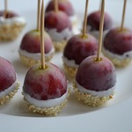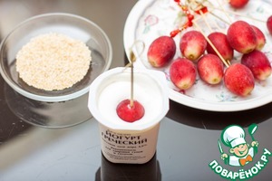 Виноградинки на шпажках окунаем в густой йогурт, он на замороженных ягодках мгновенно подмерзает и очень хорошо держится.