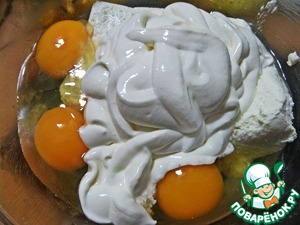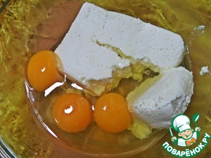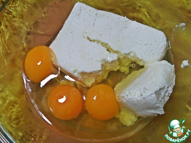 В это время смешиваем начинку. Яйца вбиваем в творог или сливочный сыр-коробочку.