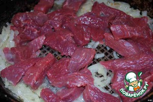 • Лук обжариваем в масле до золотистой корочки. Добавляем мясо. Жарим на большом огне 5 минут, помешивая. Закрываем сковородку крышкой, уменьшаем огонь и еще 15-20 минут.