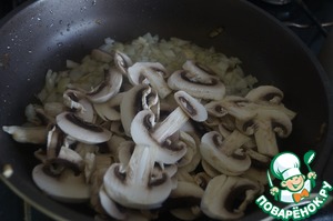 Сначала нужно приготовить печеночный паштет. Для этого измельчить лук, шампиньоны тоненько порезать. Обжарить их вместе на 1 ст. л. оливкового масла. Не стоит зажаривать до золотистой корочки, просто нужно добиться их мягкости. Снять с огня и остудить.