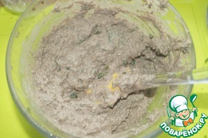 Сложить в чашу блендера печень, лук и шампиньоны. Пюрировать. Зелень измельчить.