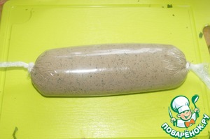 Паштет выложить на пищевую пленку. Завернуть в нее паштет придав ей цилиндрическую форму. Размер паштетной колбаски должен быть немного меньше формы для террина. Убрать паштет в морозилку. Паштет должен принять форму, но не замораживать.
