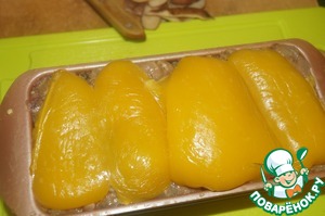 Верх застелить болгарским перцем. Обернуть форму фольгой в 3 слоя. Ставим на противень, наливаем в противень воду (создаем водяную баню). Ставим в духовку разогретую до 180 гр и запекаем в течении 1 часа 40 минут. Остужаем готовый террин до комнатной температуры, сливаем лишний сок и оборачиваем пищевой пленкой, прижимаем прессом (около 5 кг). Убираем в холодильник на сутки.