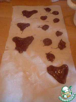 На водяной бане растопить тёмный шоколад и нарисовать на бумаге для выпечки шоколадные "сердечки" и "кружочки". Положить в морозильную камеру.